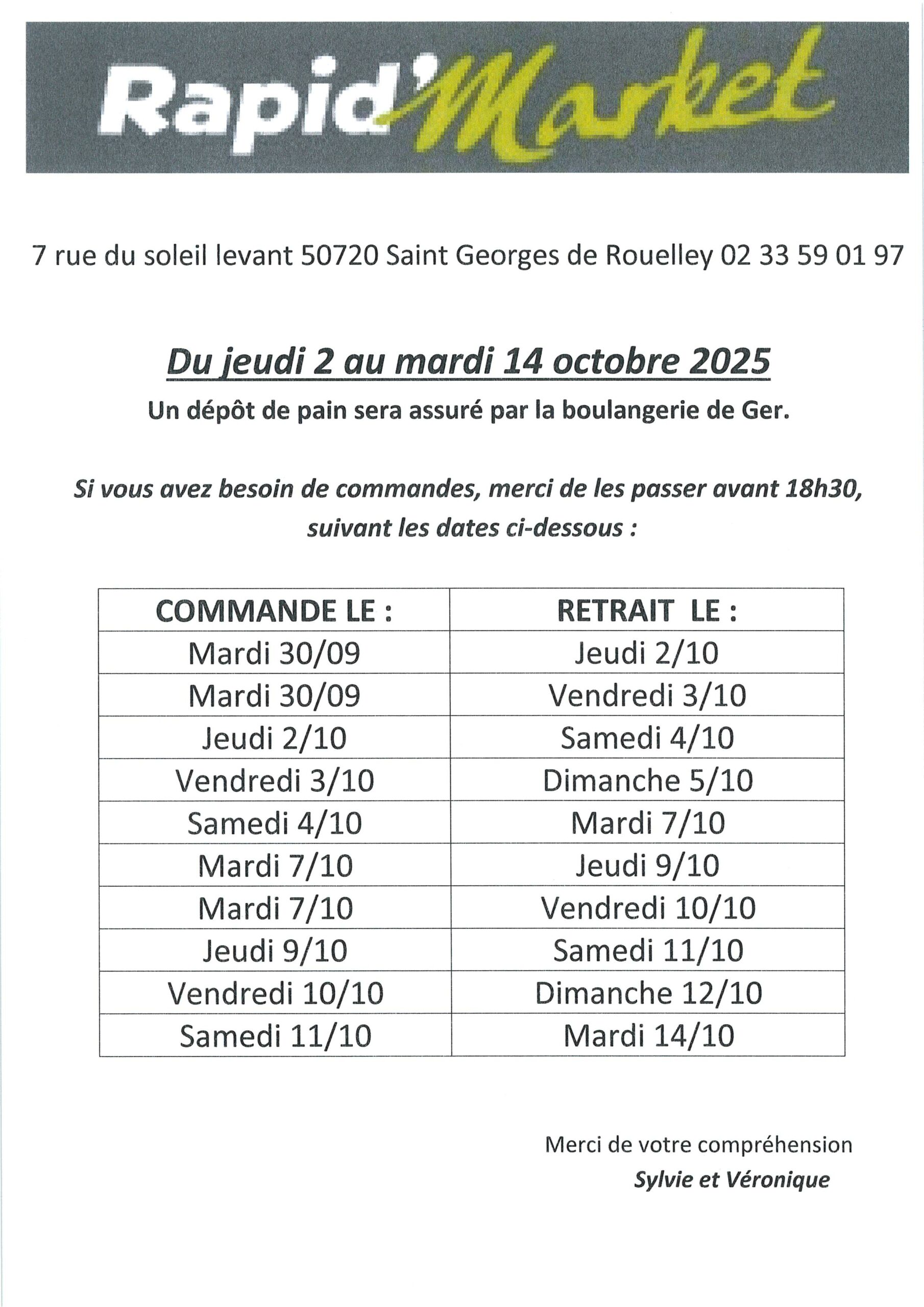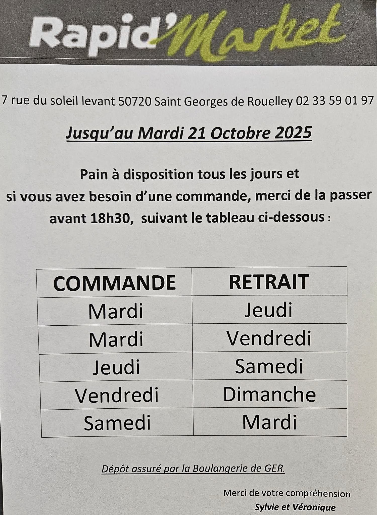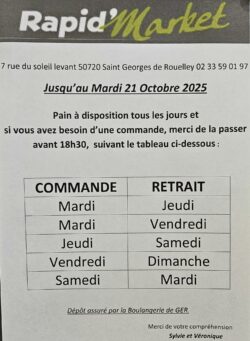 Ci-dessous les informations concernant le dépôt de pain qui sera assuré à la superette jusqu’au 21 octobre :