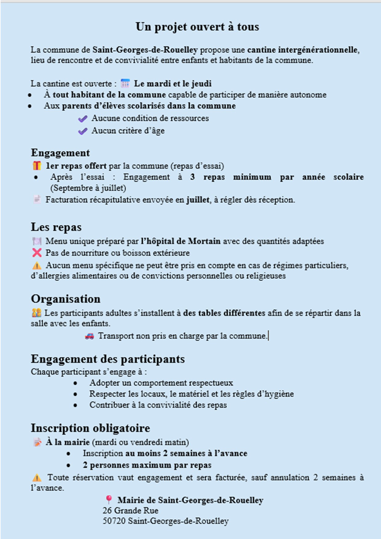 La commune de Saint-Georges-de-Rouelley propose une cantine intergénérationnelle, lieu de rencontre et de convivialité entre enfants et habitants de la commune, Le mardi et le jeudi, à tout habitant de la commune capable de participer de manière autonome